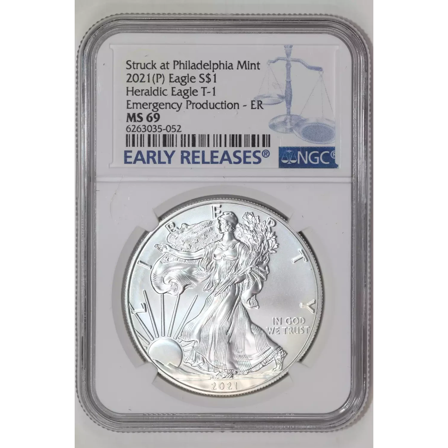 2021 (P) SILVER HERALDIC EAGLE TYPE 1 NGC MS69 EMERGENCY STRUCK AT PHILADELPHIA MINT