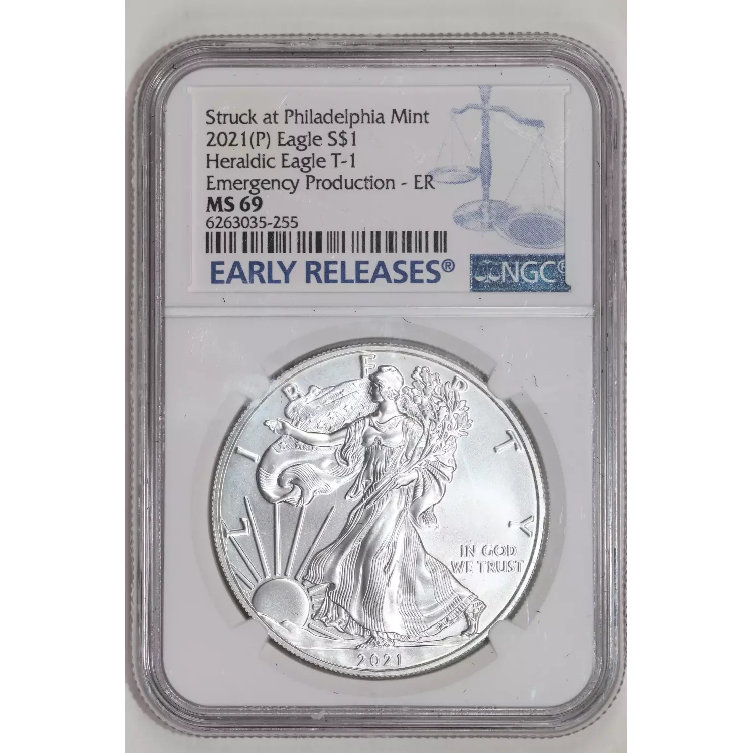 2021 (P) SILVER HERALDIC EAGLE TYPE 1 NGC MS69 EMERGENCY STRUCK AT PHILADELPHIA MINT