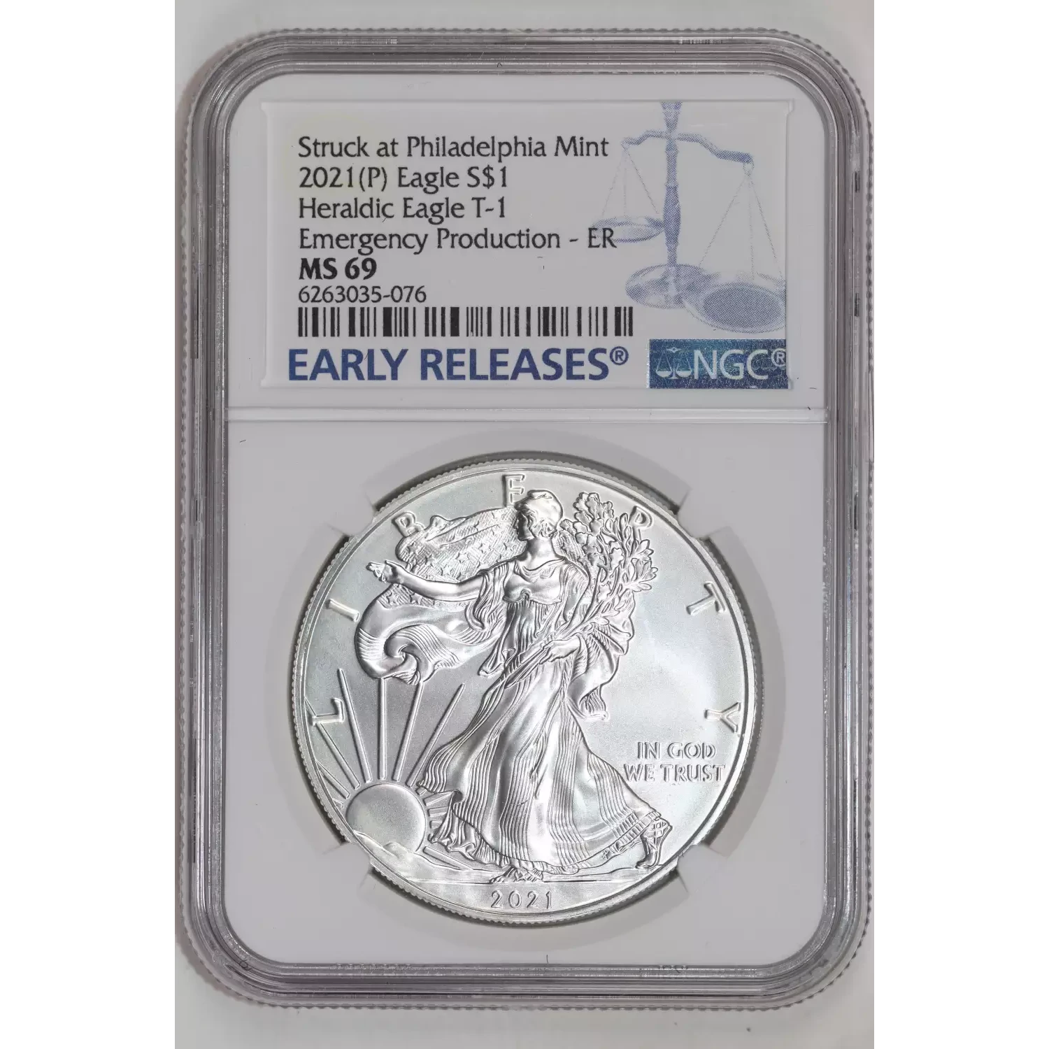 2021 (P) SILVER HERALDIC EAGLE TYPE 1 NGC MS69 EMERGENCY STRUCK AT PHILADELPHIA MINT