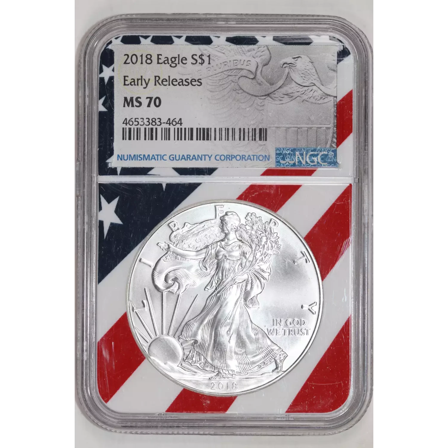2018 SILVER AMERICAN EAGLE NGC MS70 FLAG LABEL EARLY RELEASE