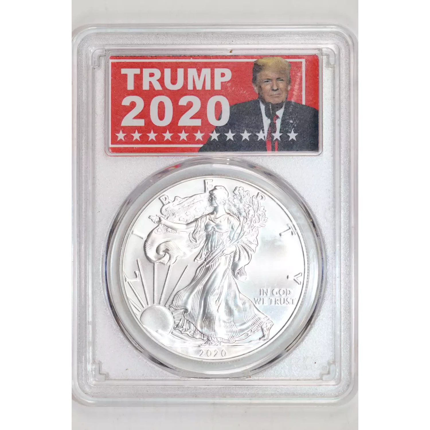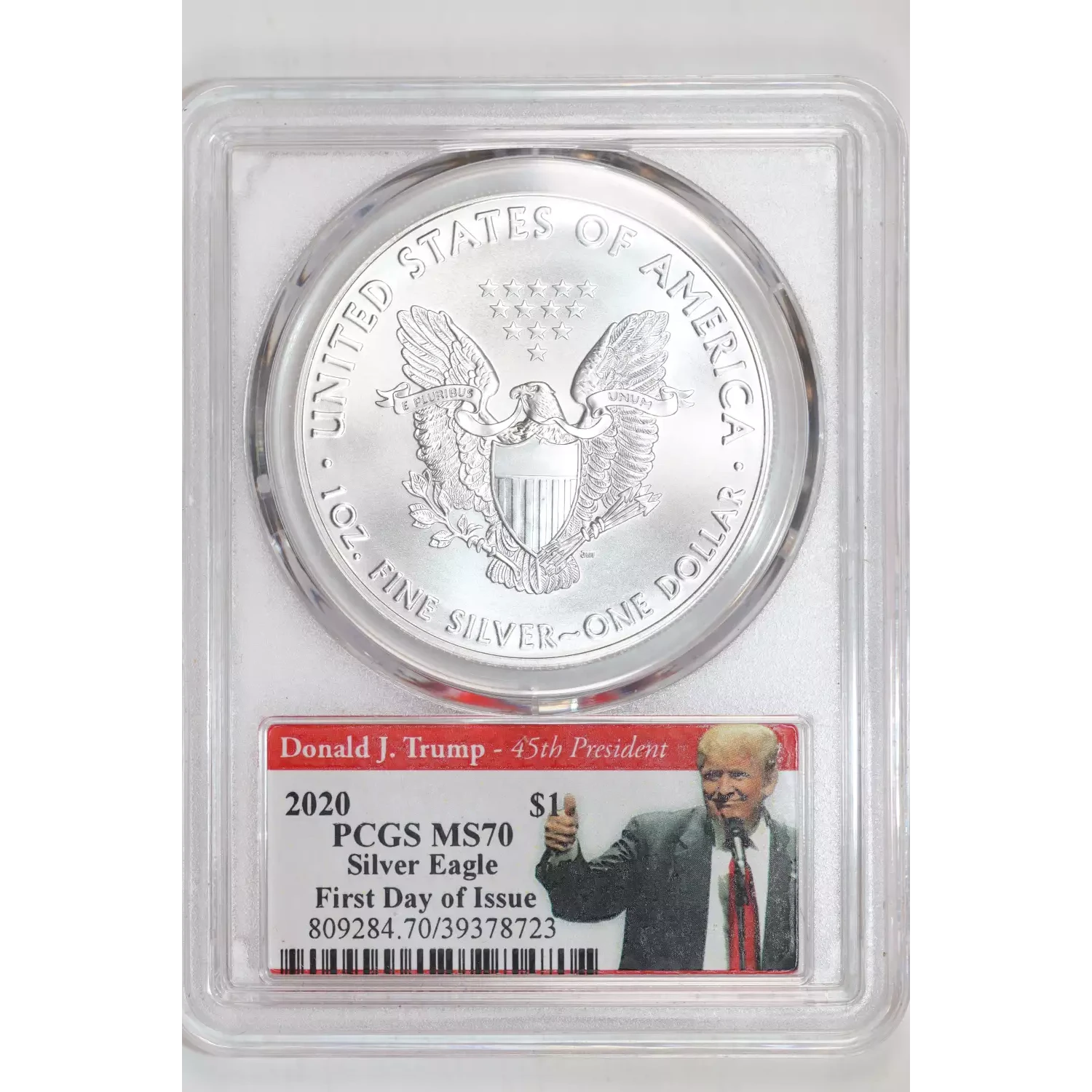 2020 SILVER EAGLE PCGS MS70 FDOI TRUMP LABEL