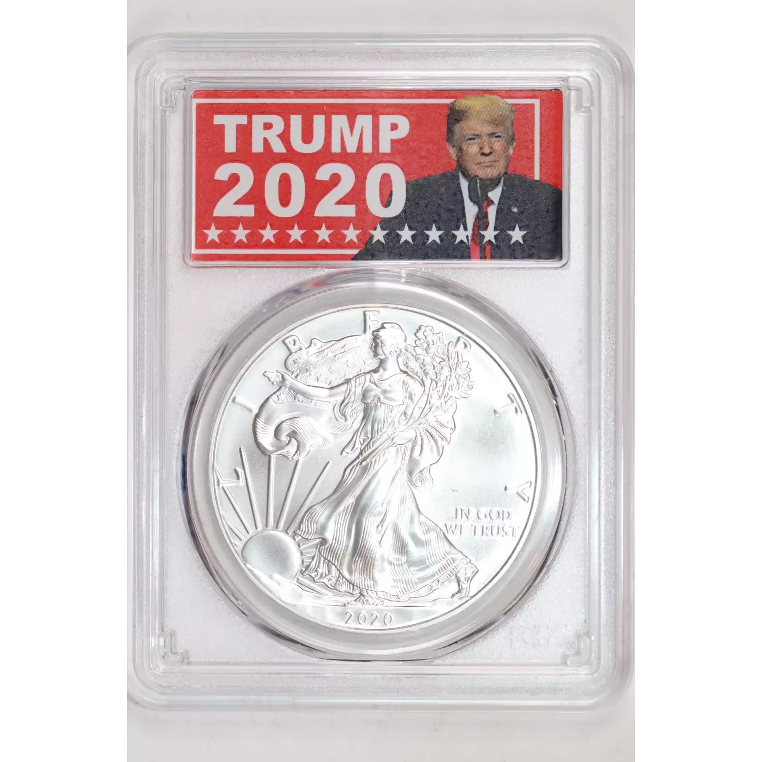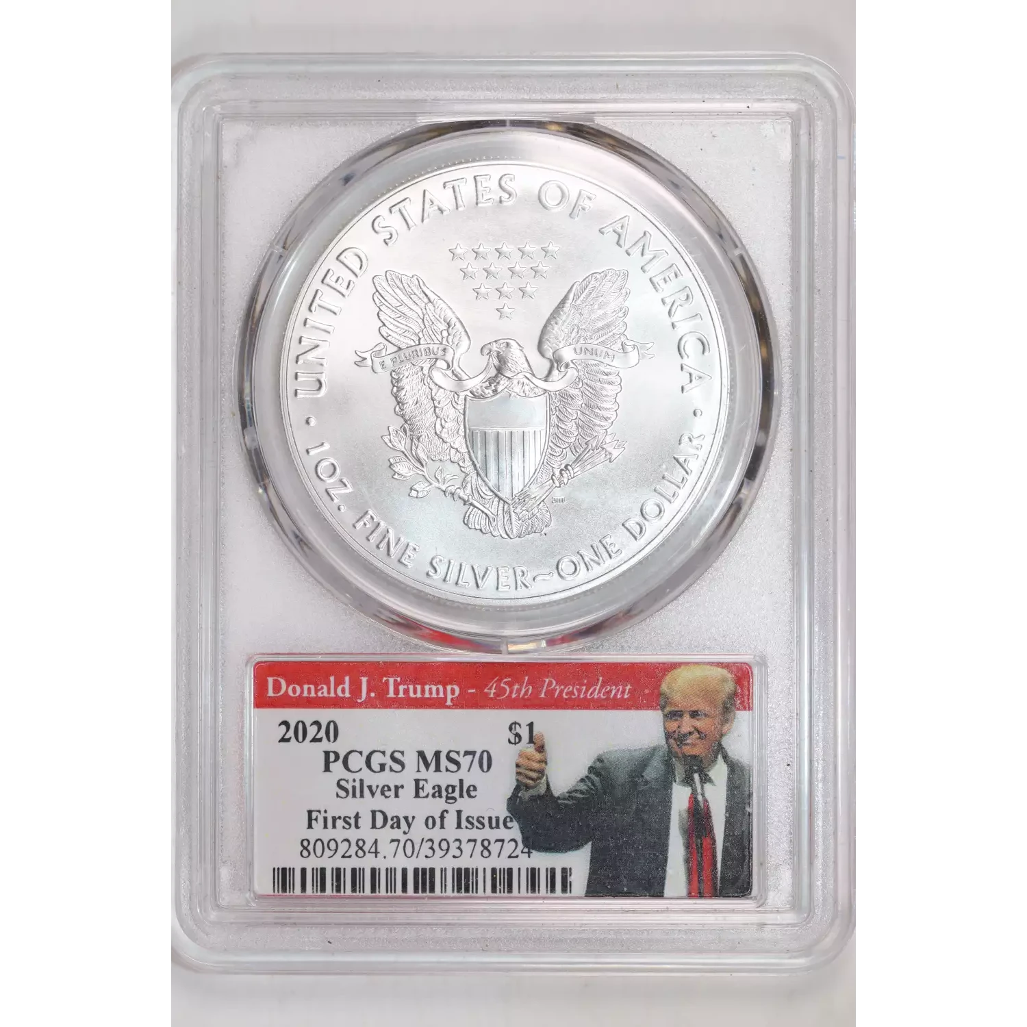 2020 SILVER EAGLE PCGS MS70 FDOI TRUMP LABEL