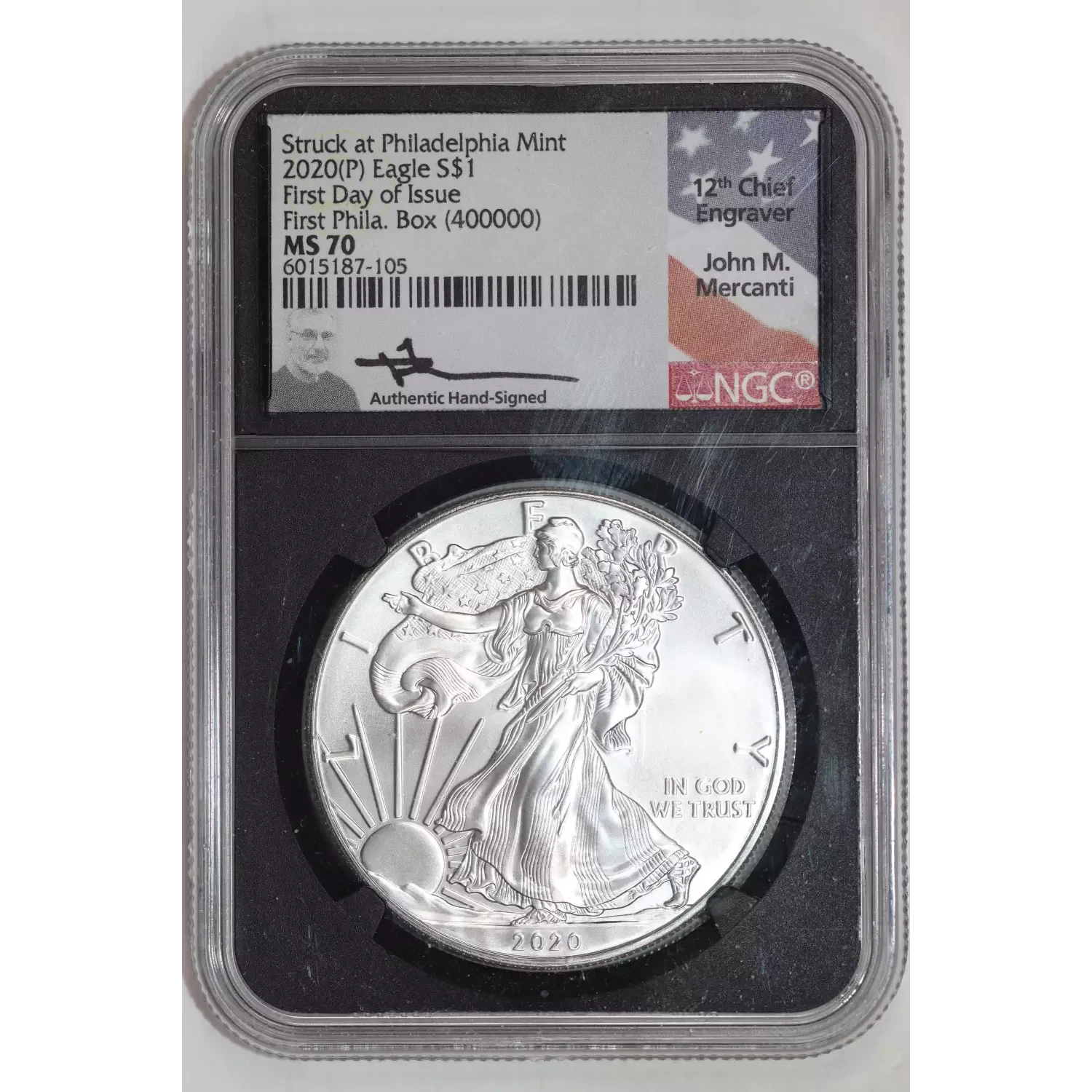 2020 (P) SILVER EAGLE NGC MS70 STRUCK AT PHILADELPHIA MINT FIRST BOX MERCANTI
