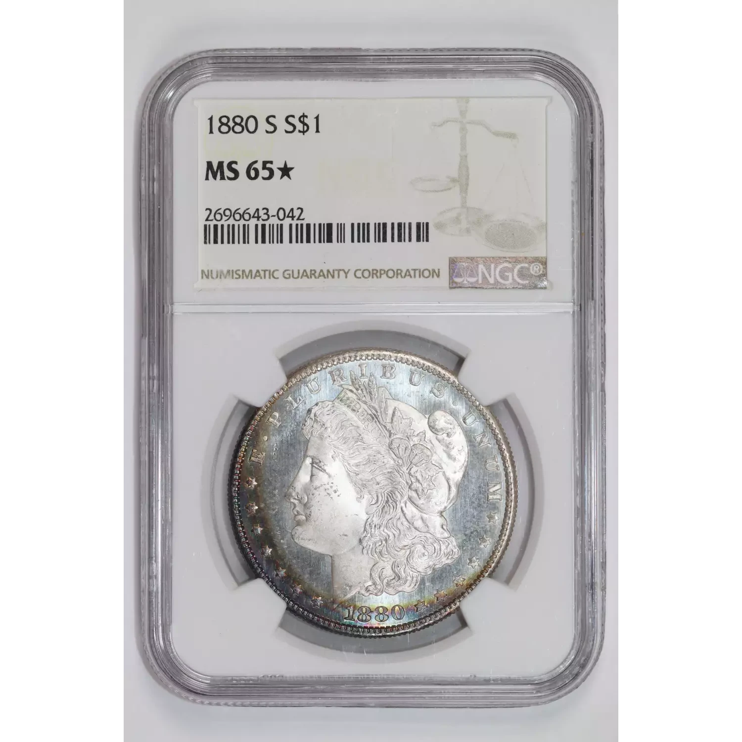 1880-S MORGAN DOLLAR NGC MS65* STAR RAINBOW CRESCENT TONING!
