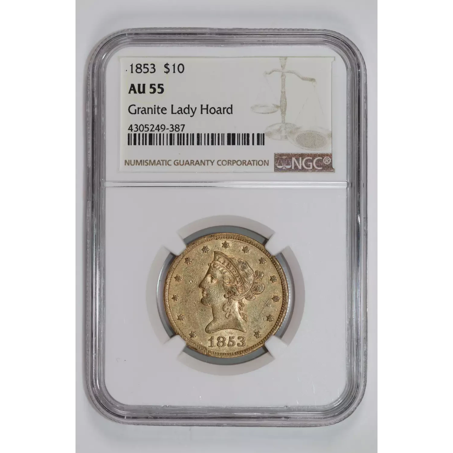 1853 $10 GOLD LIBERTY EAGLE NGC AU55 GRANITE LADY HOARD