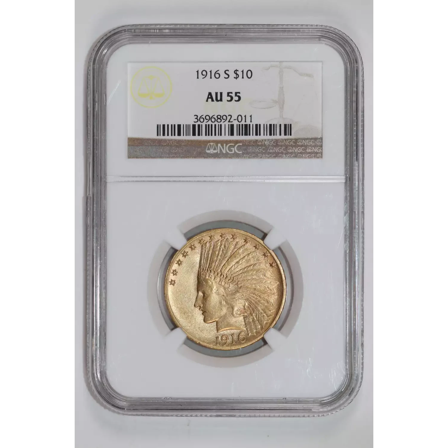 1916-S $10 GOLD INDIAN EAGLE NGC AU55