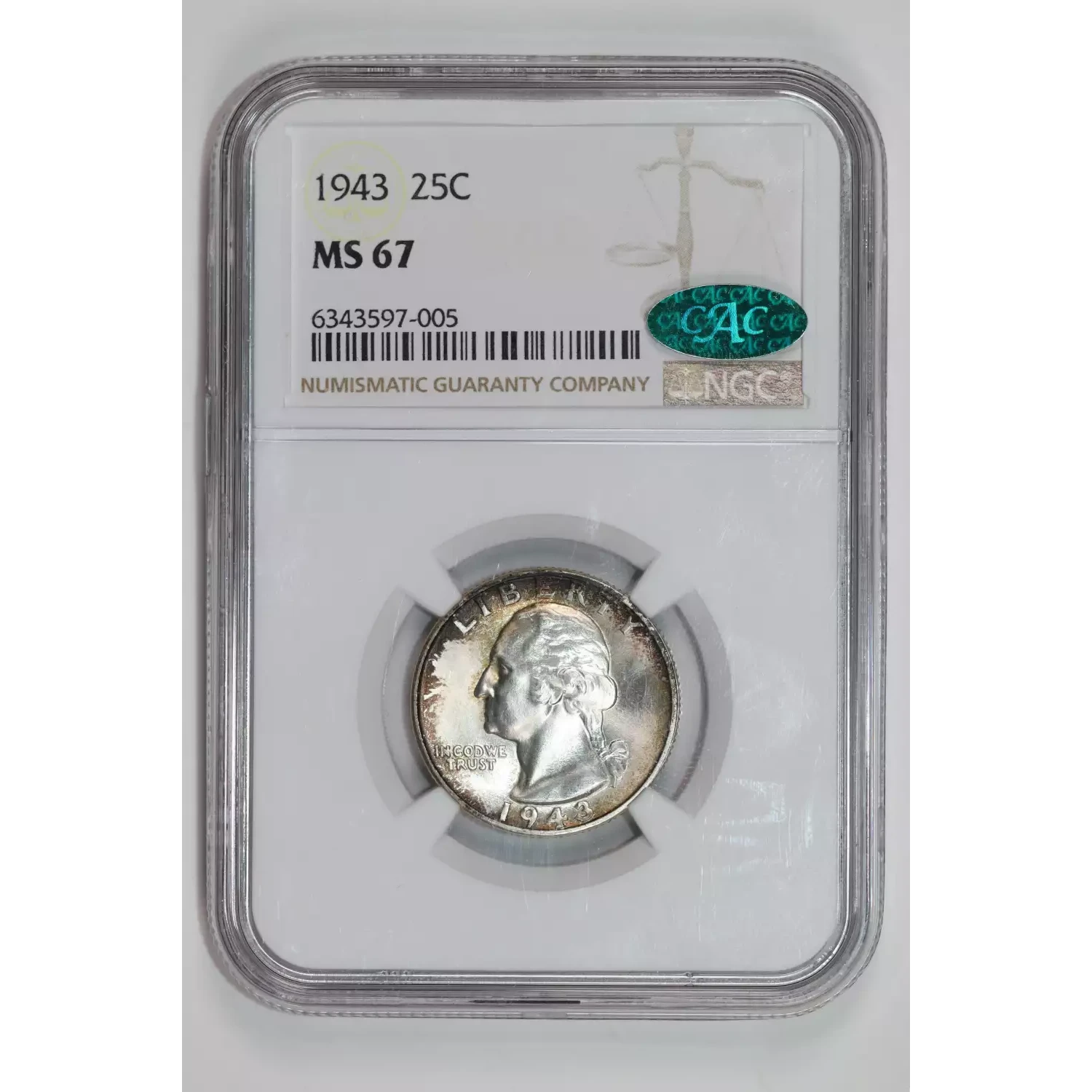 1943 WASHINGTON QUARTER NGC MS67 CAC VERY PQ!