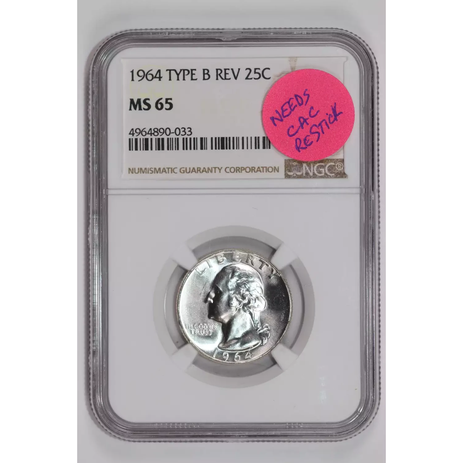1964 TYPE B REVERSE WASHINGTON QUARTER NGC MS65