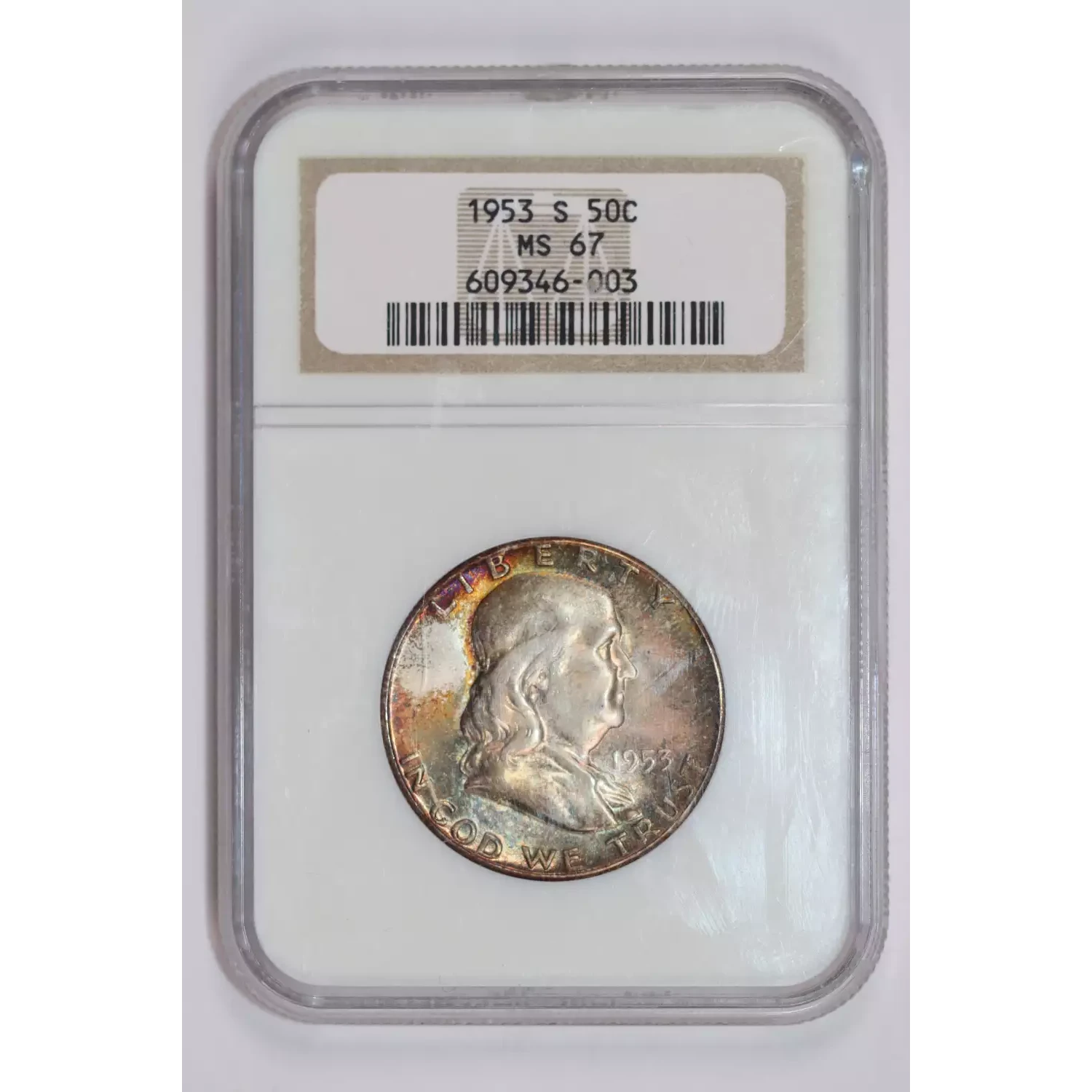1953-S FRANKLIN HALF DOLLAR NGC MS67 PRETTY COLOR!