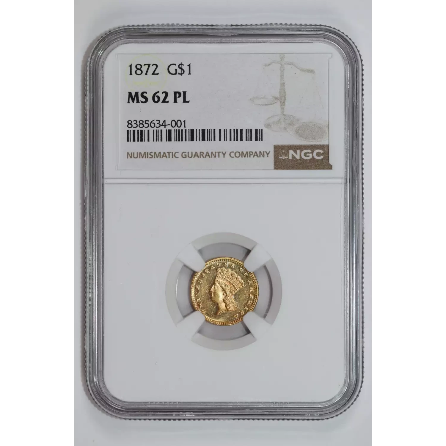 1872 GOLD DOLLAR NGC MS62 PL - RARE DATE PL!