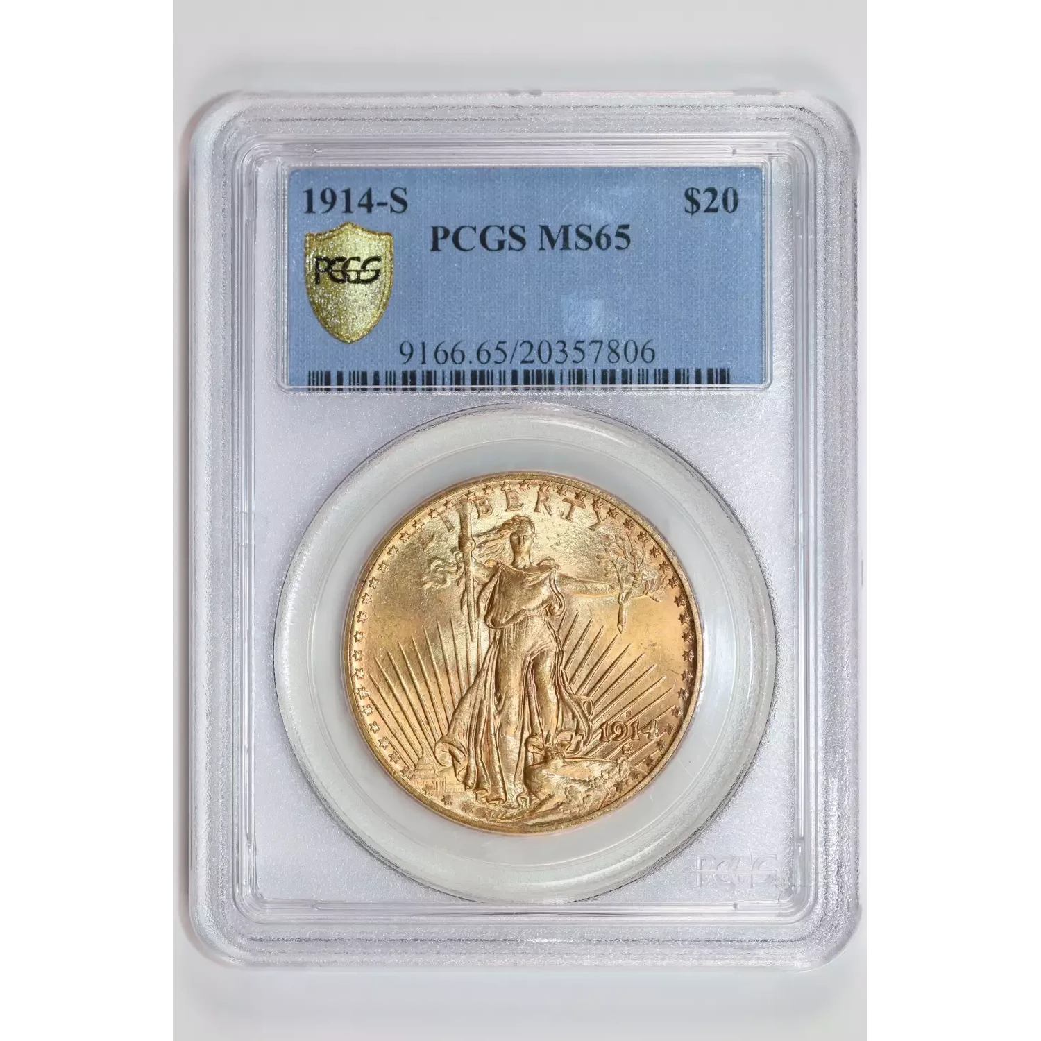 1914-S $20 GOLD SAINT GAUDENS DOUBLE EAGLE PCGS MS65 VERY PQ!