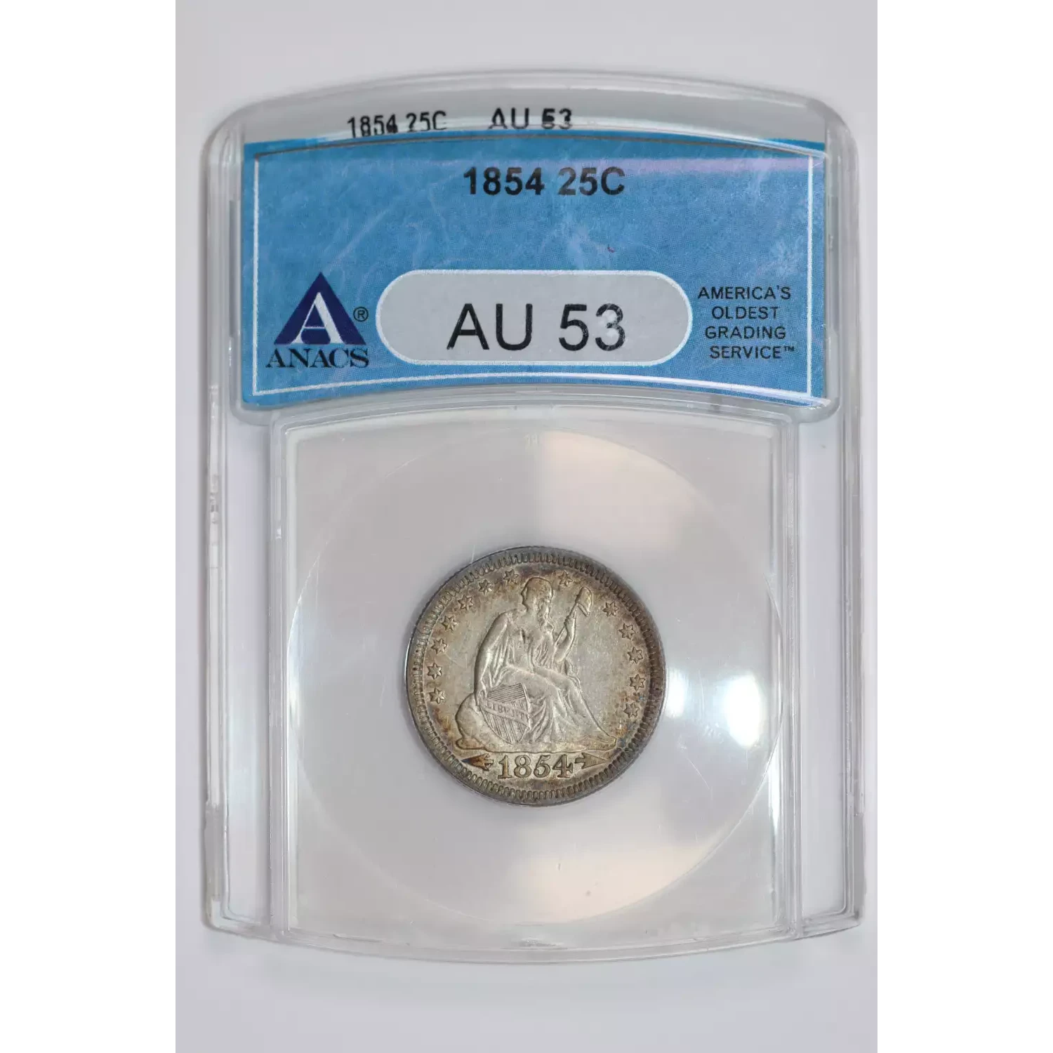 1854 ARROWS SEATED LIBERTY QUARTER ANACS AU53 - VERY CHOICE! PQ ORIGINAL!