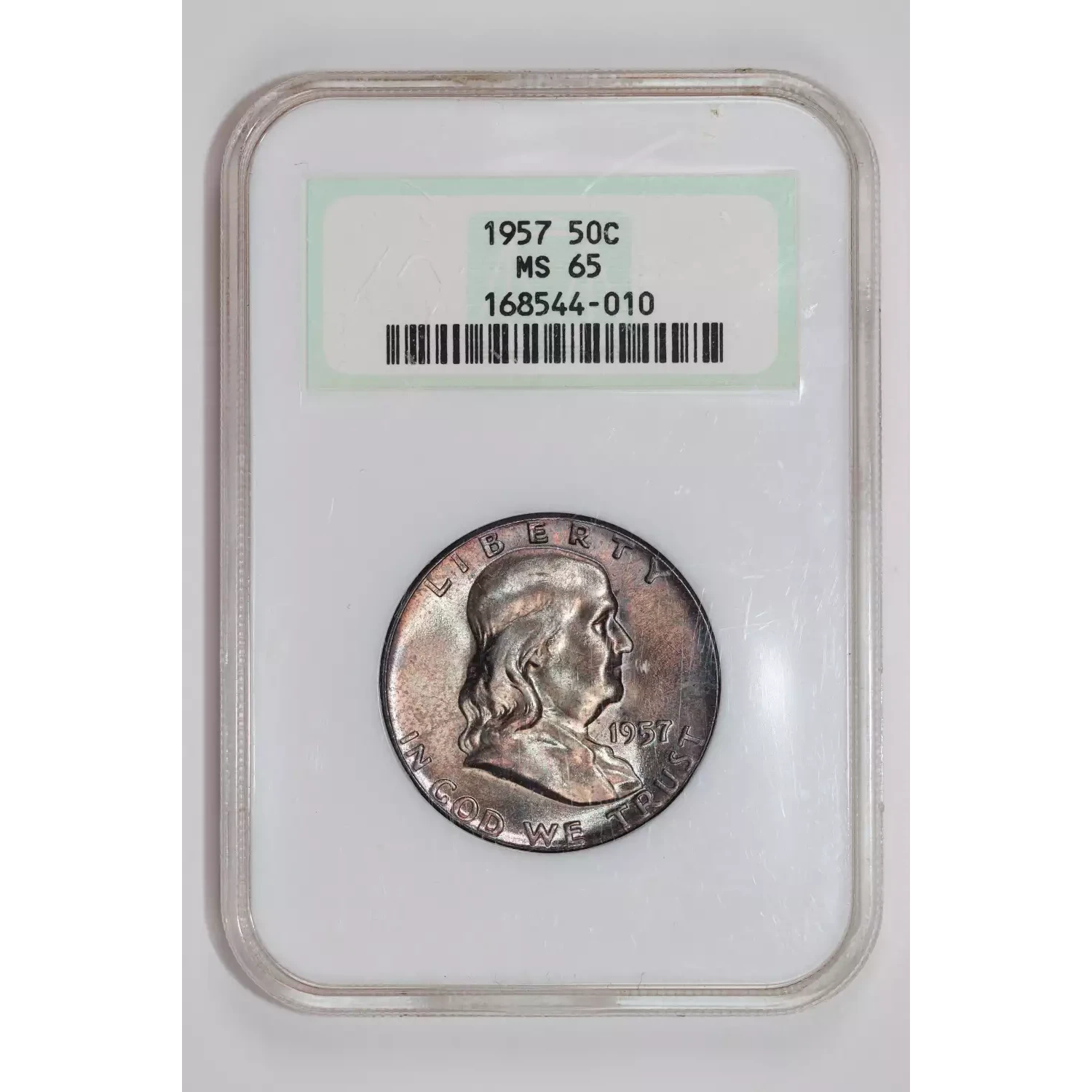 1957 FRANKLIN HALF DOLLAR NGC MS65 VERY PRETTY TONING! OLD FATTY HOLDER!