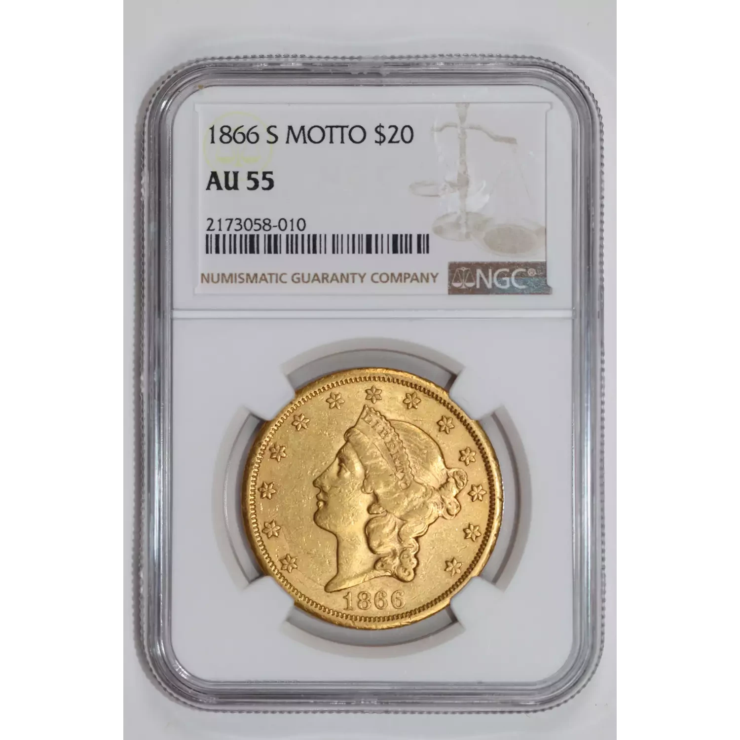 1866-S MOTTO $20 GOLD LIBERTY DOUBLE EAGLE NGC AU55 PQ!