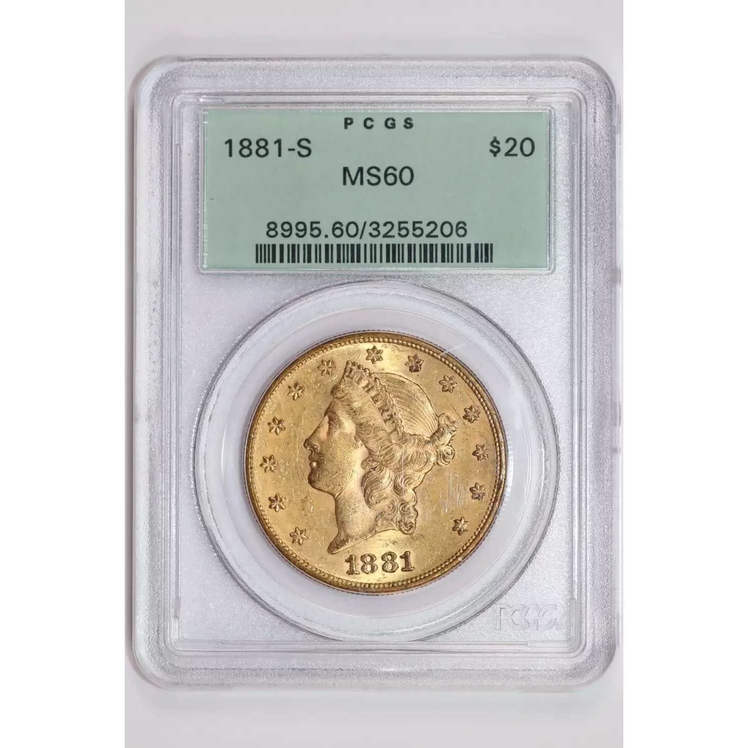 1881-S $20 GOLD LIBERTY DOUBLE EAGLE PCGS MS60 OGH - TOUGH DATE!