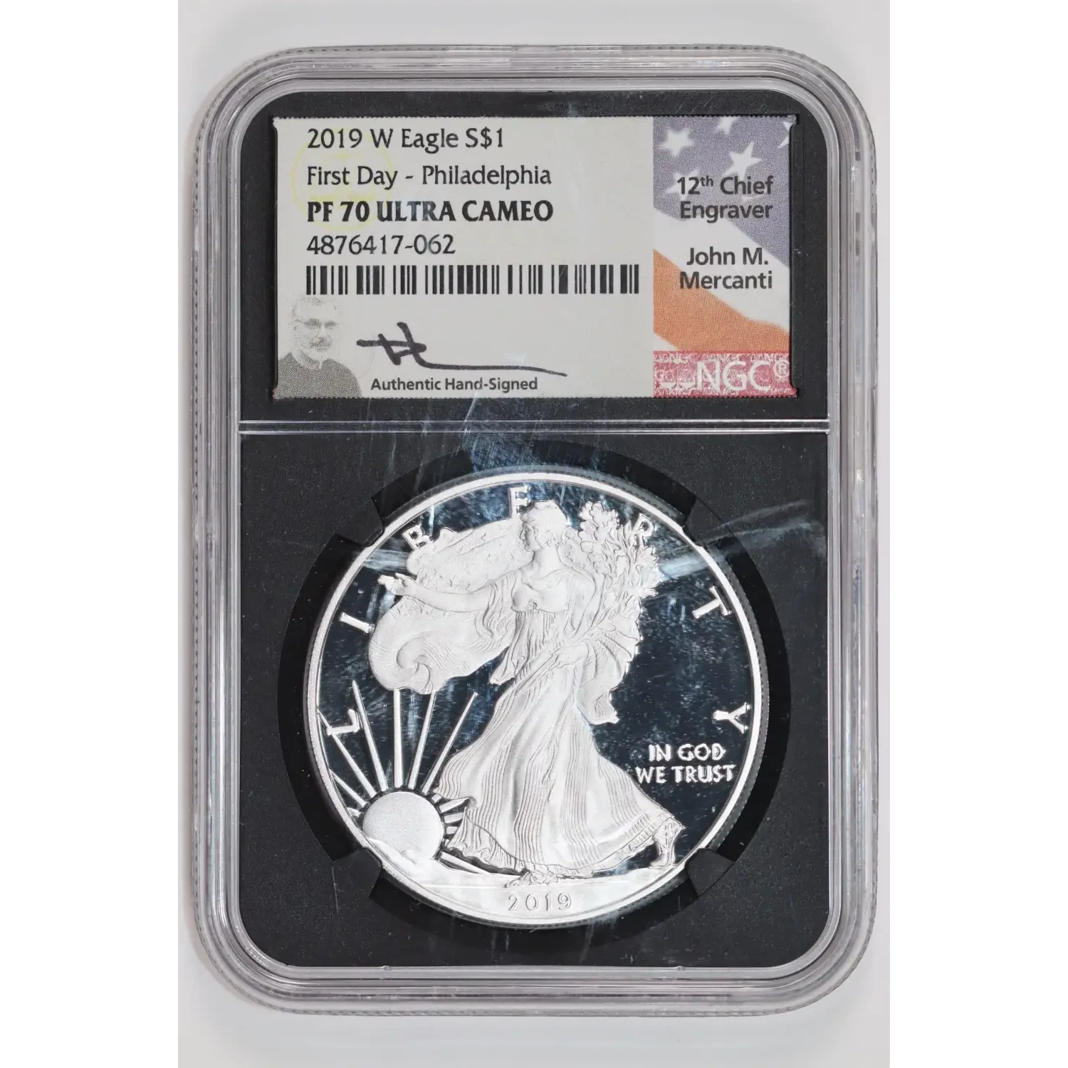 2019-W PROOF SILVER EAGLE FIRST DAY PHILADELPHIA NGC PR70 UCAM MERCANTI