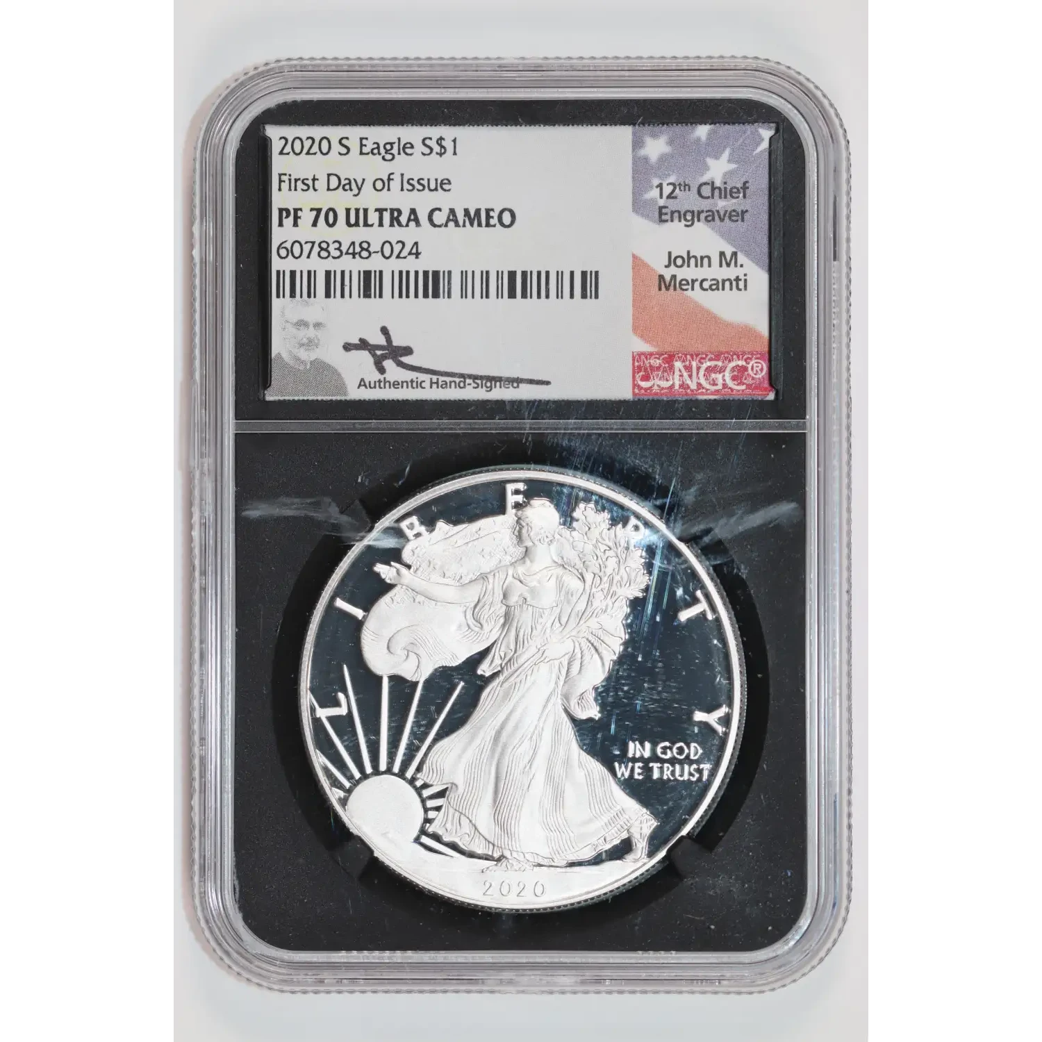 2020-S PROOF SILVER EAGLE FIRST DAY OF ISSUE NGC PR70 UCAM MERCANTI