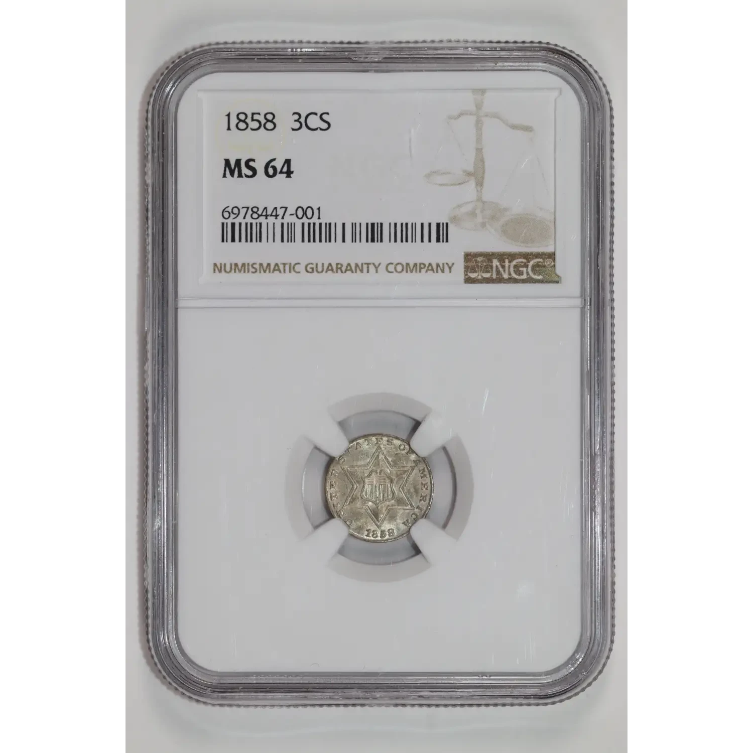 1858 Silver Three Cent Pieces - Trimes NGC MS-64