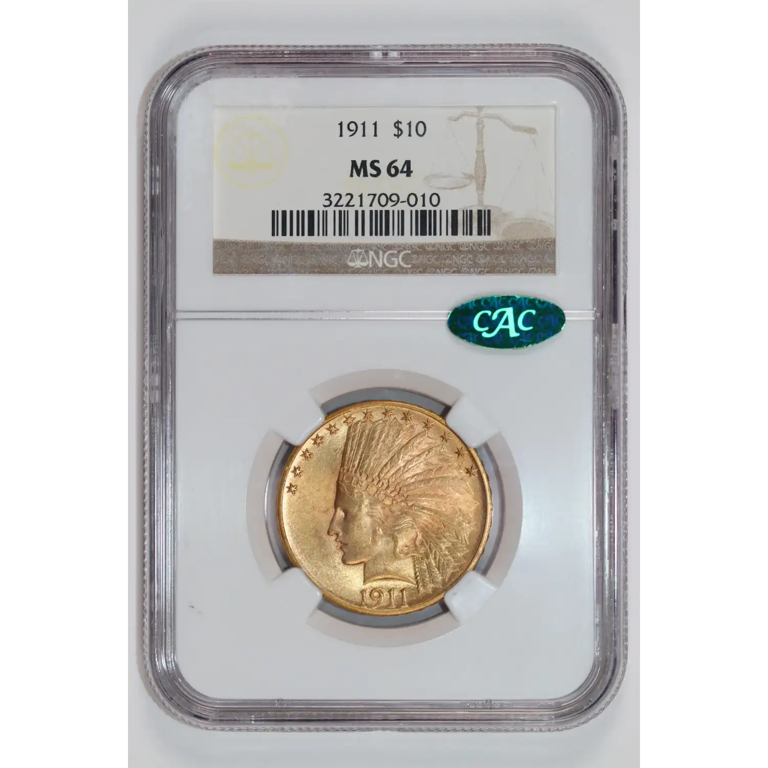 1911 $10 GOLD INDIAN EAGLE NGC MS64 CAC