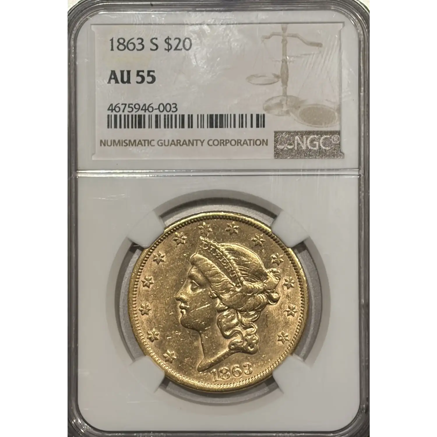 1863-S $20 GOLD LIBERTY DOUBLE EAGLE NGC AU55