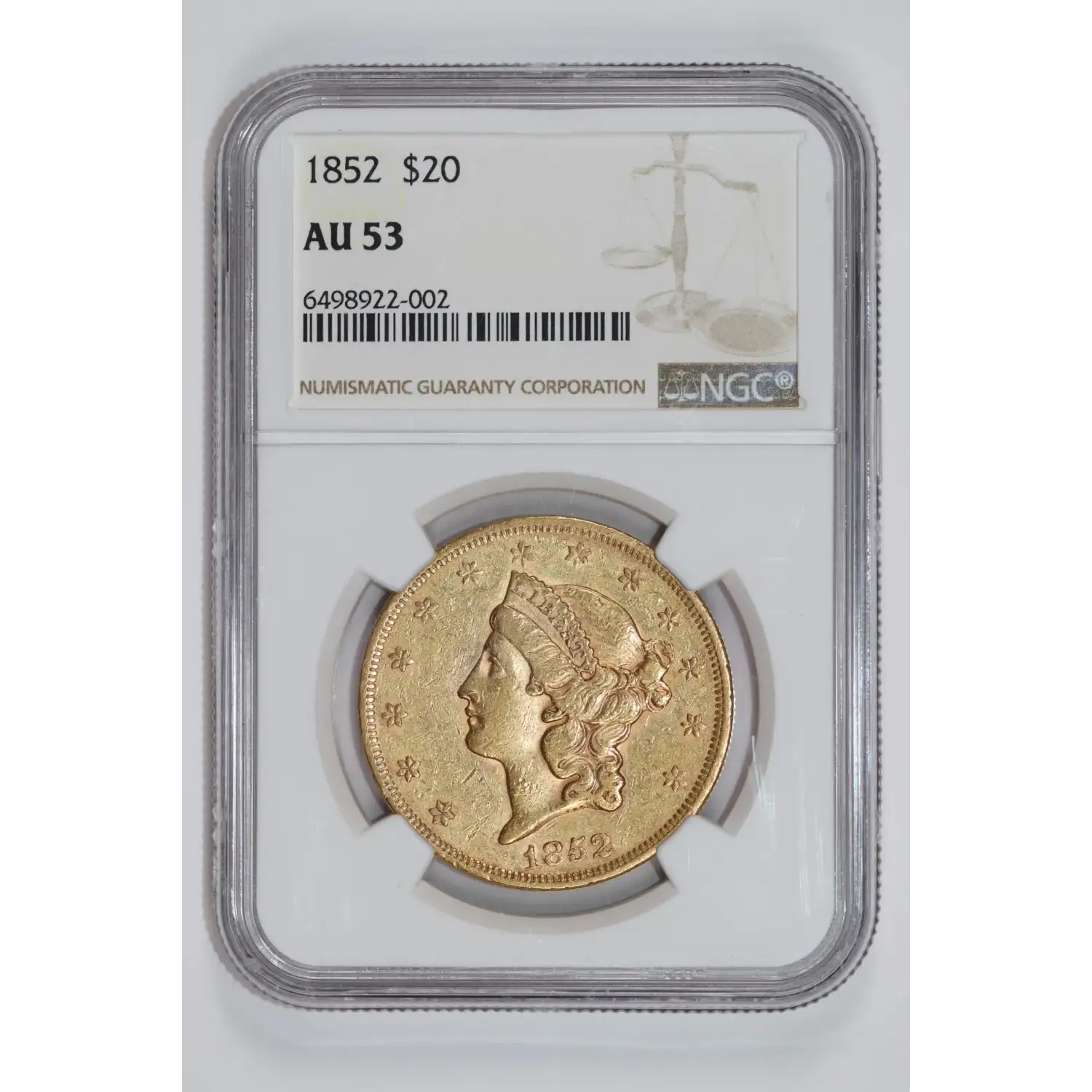 1852 $20 GOLD LIBERTY DOUBLE EAGLE NGC AU53