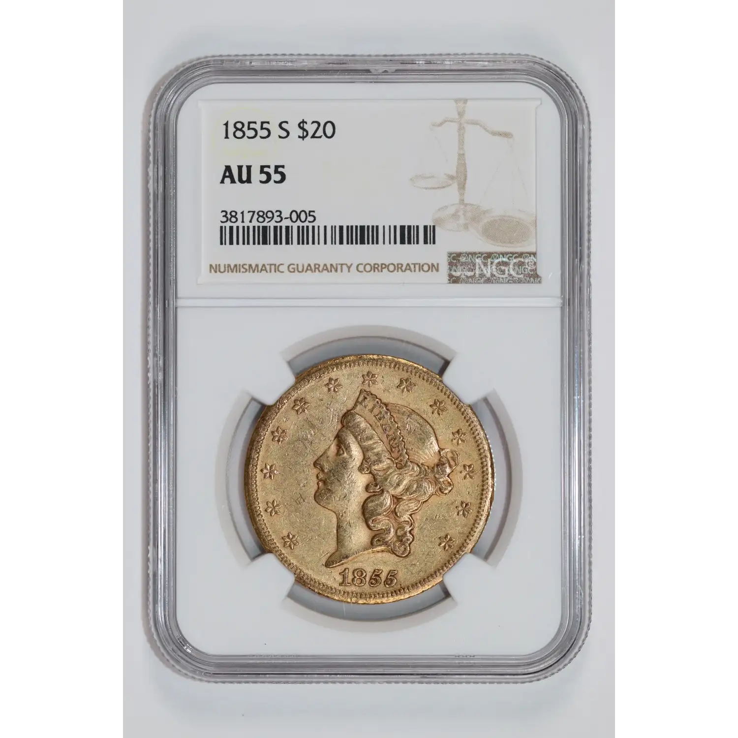 1855-S $20 GOLD LIBERTY DOUBLE EAGLE NGC AU55