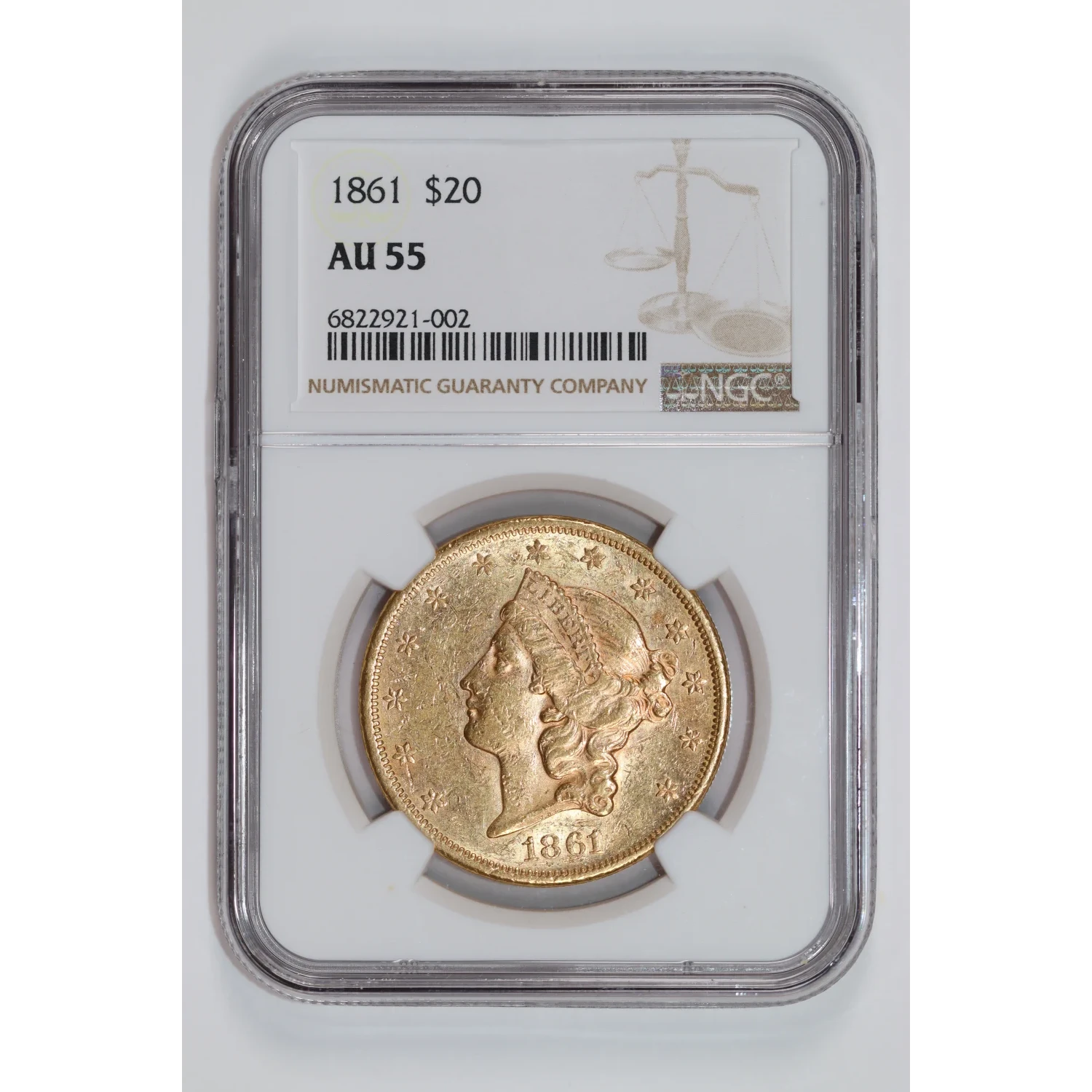 1861 $20 GOLD LIBERTY DOUBLE EAGLE NGC AU55