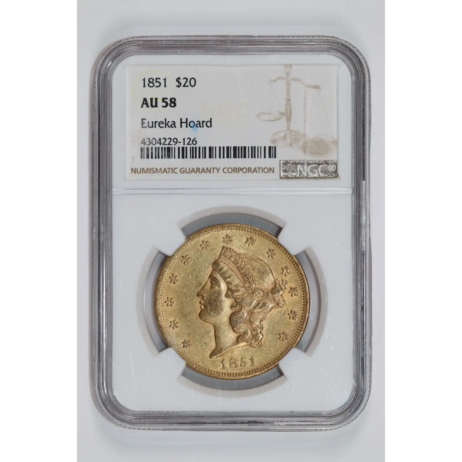 1851 $20 GOLD LIBERTY DOUBLE EAGLE NGC AU58 EUREKA HOARD