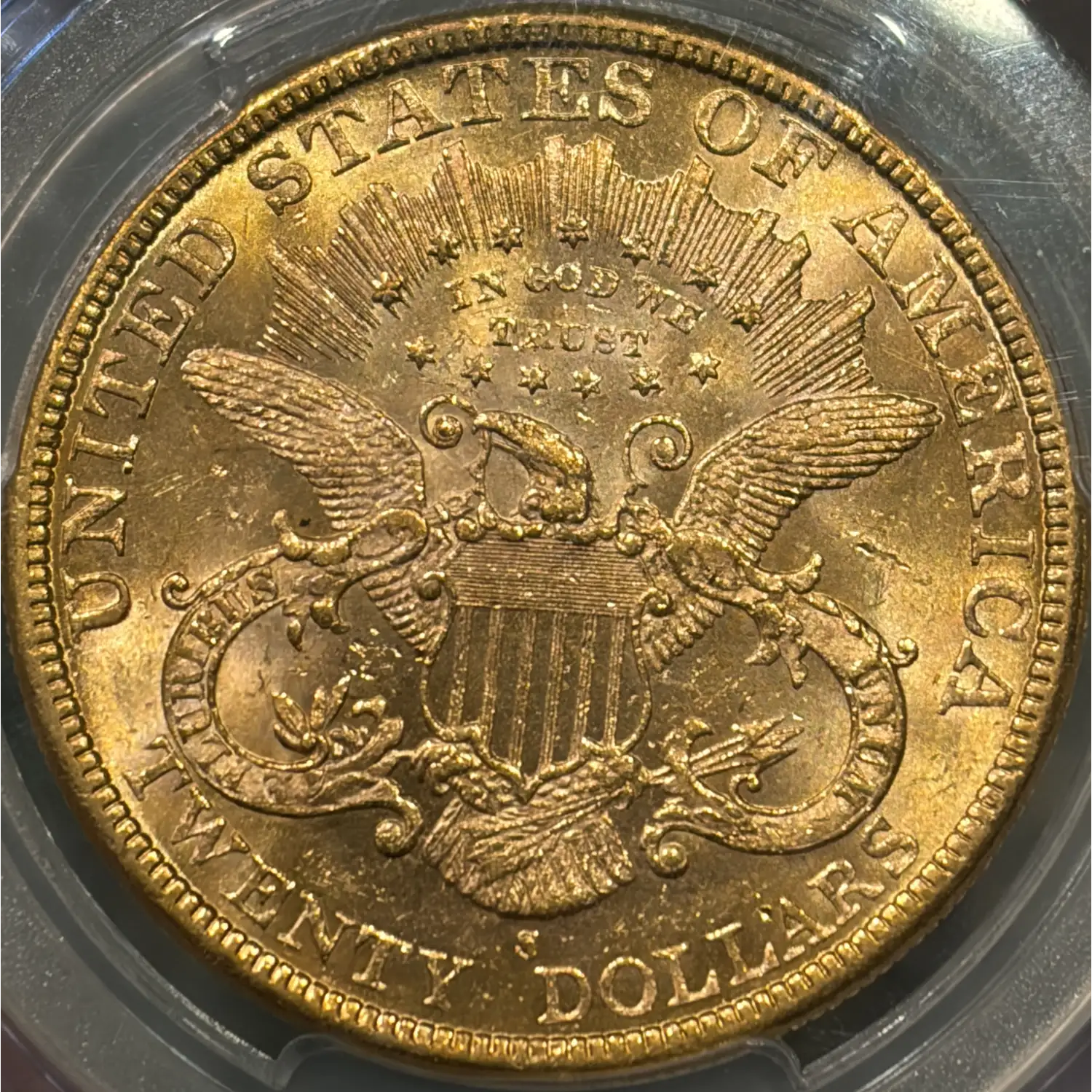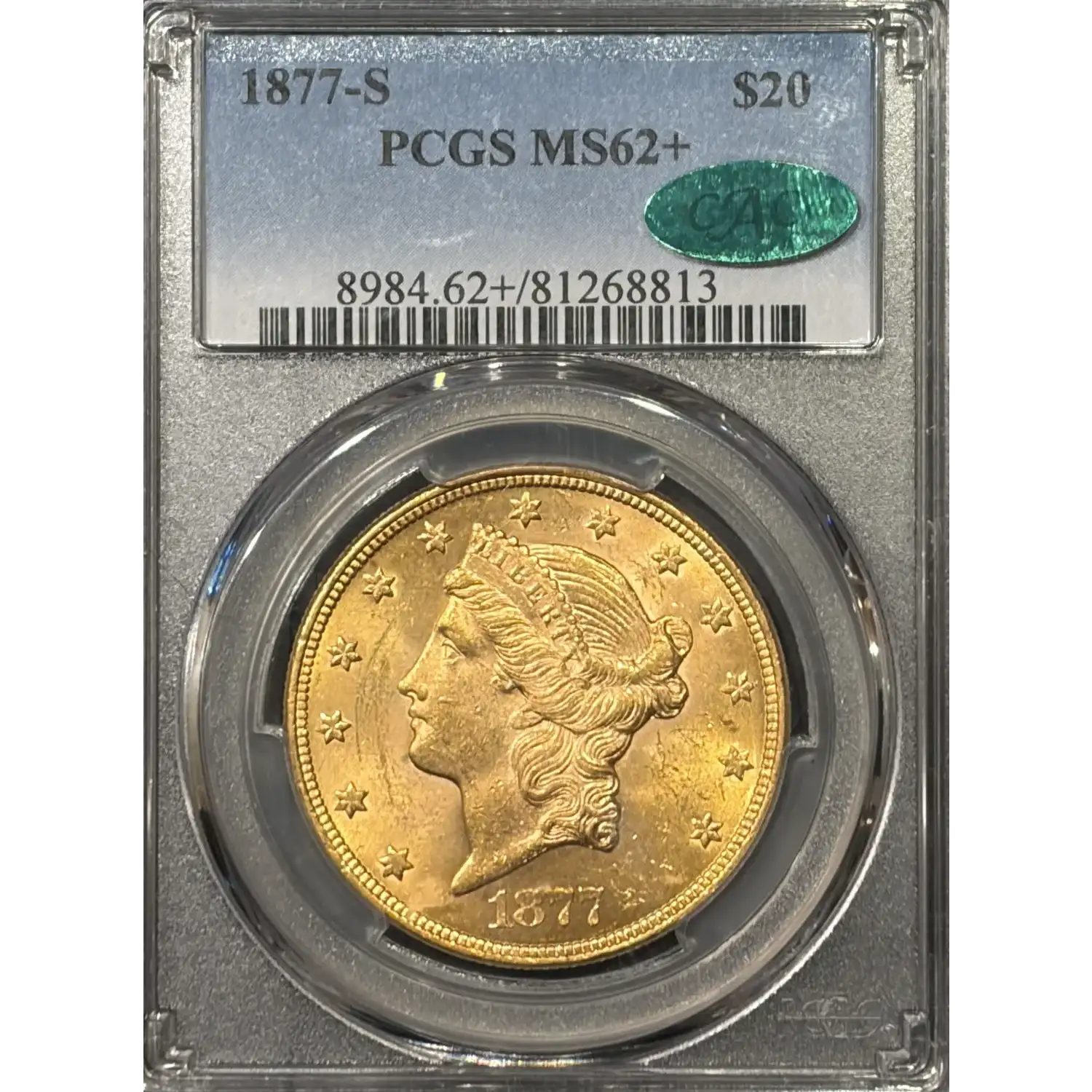 1877-S $20 GOLD LIBERTY DOUBLE EAGLE PCGS MS62+ CAC