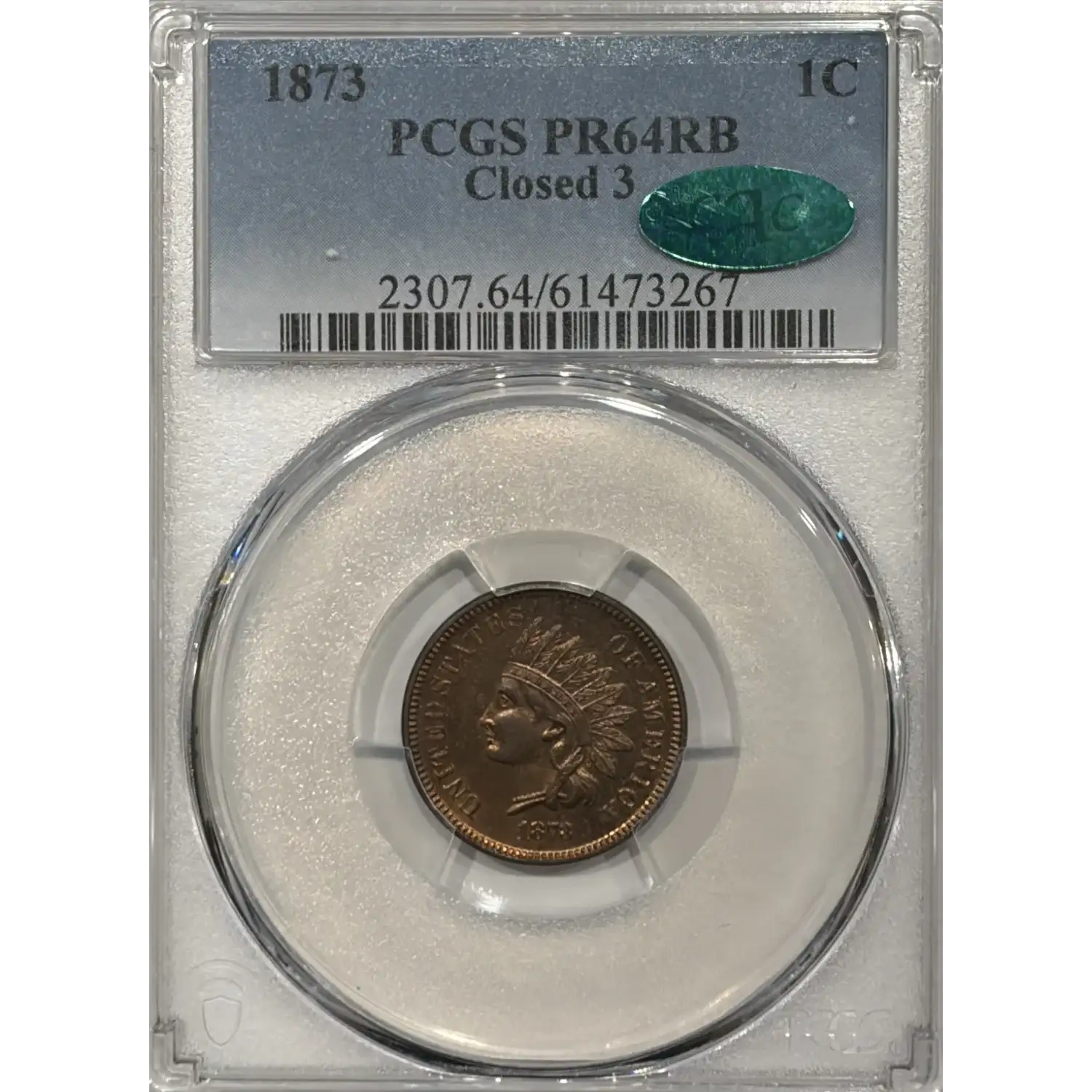 1873 PROOF INDIAN CENT CLOSED 3 PCGS PR64 RB CAC