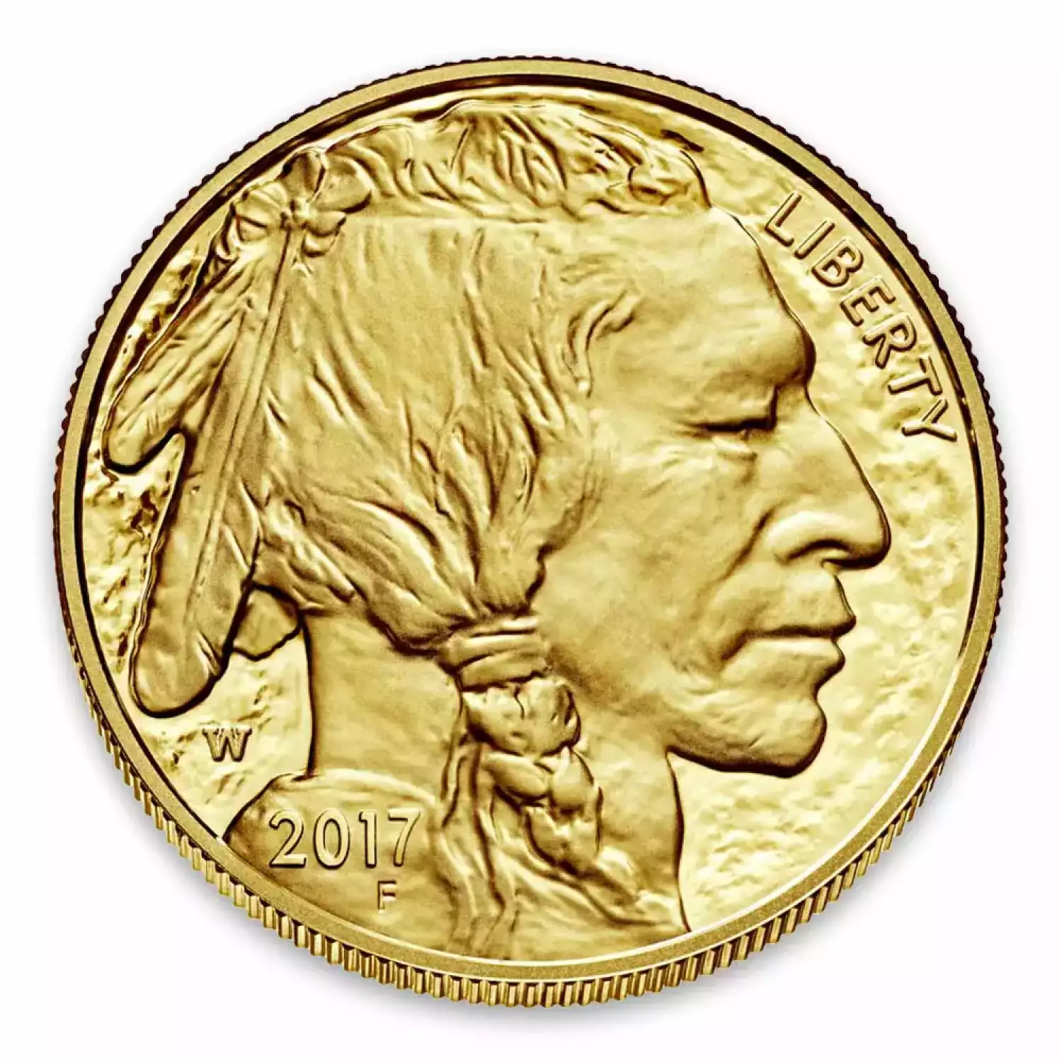 Many gold investors and coin collectors alike find this gold bullion coin to be one of the most beautiful designs of all commodity gold bullion coins. The 1 oz American gold coin comes in only the 1 troy ounce size, unlike its cousin the American Gold Eagle, which comes in fractional gold coin sizes as well. These 1 oz gold buffalo coins are shipped by the US Mint in tubes of 20 coins per tube. The United States Mint makes two version of the American Gold Buffalo. A brilliant uncirculated (BU) version, which is the most common, and a proof version which is produced with an ultra cameo finish. The proof version of the American Gold Buffalo coin is significantly more expensive than the BU American Gold Buffalo and carries some collector value above the regular price of a BU Gold Buffalo. On the proof version, both the image of Native American and the Gold Bison is in a matte finish with the background in a glossy finish, making the images on both the obverse and reverse of the coin "pop" out of the coin.