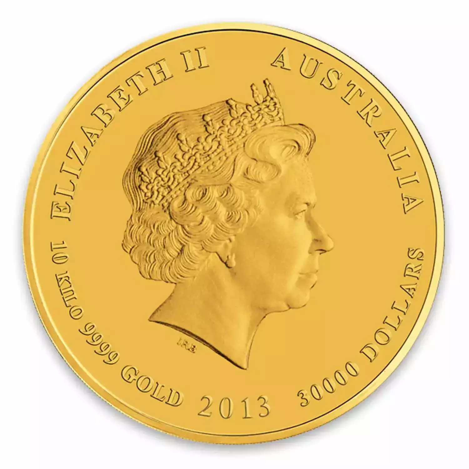 The 2013 10kg Australian Perth Mint Gold Lunar II: Year of the Snake is guaranteed by the Federal Government of Australia. The obverse side of the coin displays the portrait of Her Majesty Queen Elizabeth II. This gold coin features an image of a snake curling amongst grass and bamboo shoots on the reverse.