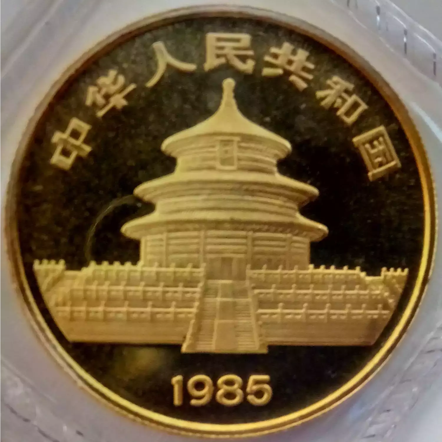 The 1985 Chinese Gold Panda coin is minted as .999 fine gold, 24 karat.