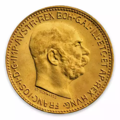 The Obverse of the gold coin features a right facing bust of Franz Joseph I, emperor of Austria-Hungary, surrounded by the legend in Latin. These strikingly beautiful coins are struck by the Austrian Mint.