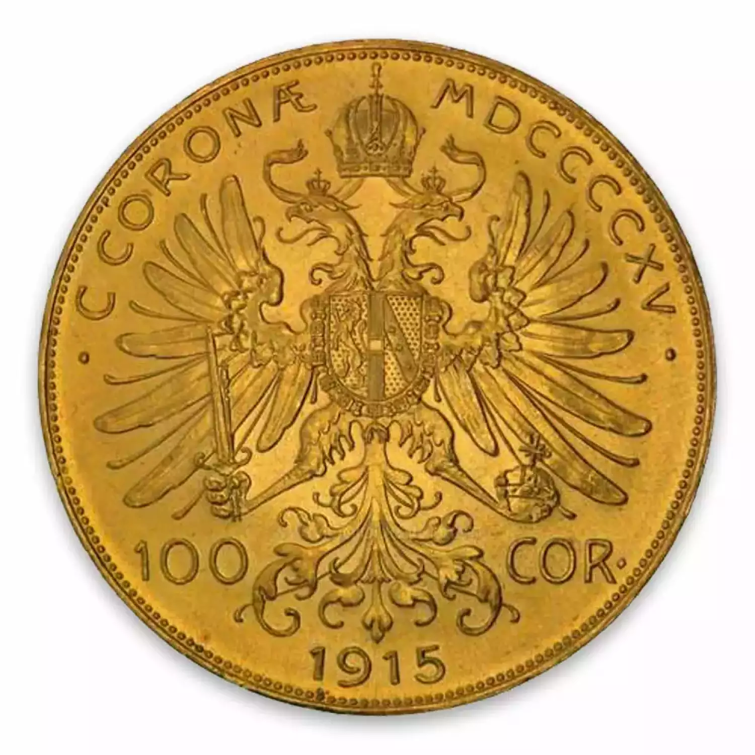 The Obverse of the gold coin features a right facing bust of Franz Joseph I, emperor of Austria-Hungary, surrounded by the legend in Latin. These strikingly beautiful coins are struck by the Austrian Mint.