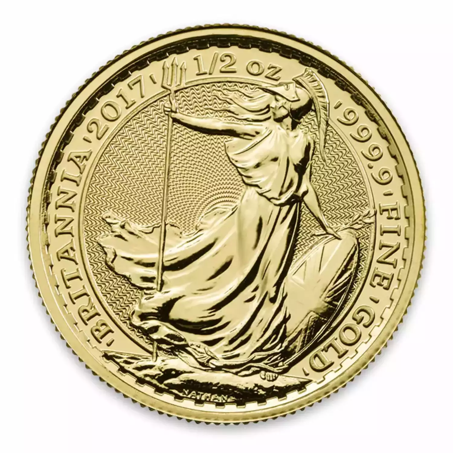 Each 1/2 oz 2017 British Gold Britannia contains 0.5 troy ounce of .9999 fine gold.